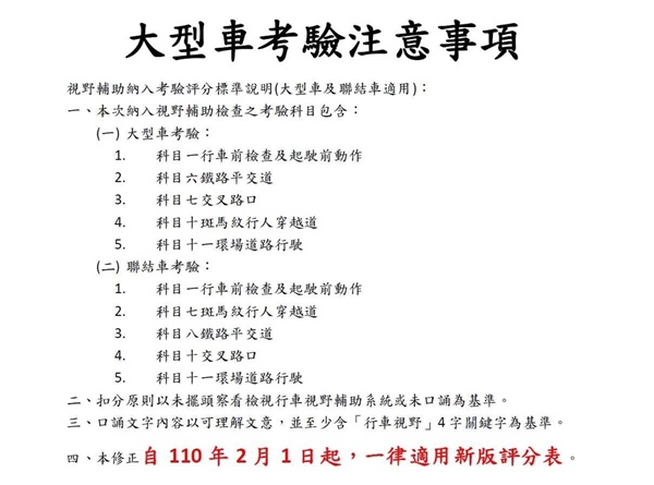 自110年2月1日起,行車視野輔助系統正式納入大型車駕照考驗評分項目。